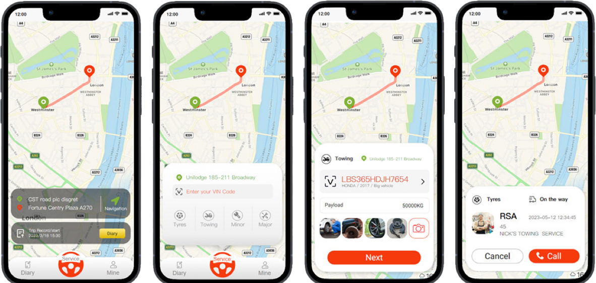 Providing drivers with crucial information on services such as mobile emergency service, tyre service, towing, roadside assistance, daily maintenance, driving diary, task navigation, etc.
